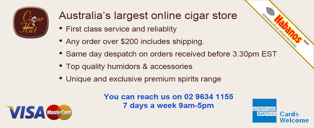 We also carry a full line of cigar smoking accessories such as cutters, holders, ashtrays and humidors. We take great pride in being Australia's exclusive boutique cigar merchant and are pleased to offer the discerning cigar connoisseur the finest selection of hard to find cigars anywhere. When you order from our website you will be guaranteed that the product you buy will be delivered in perfect condition with our quality money back promise. Your complete satisfaction is our only objective.